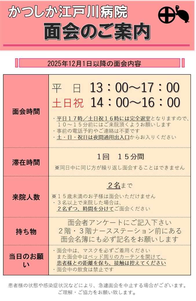 面会時間変更のお知らせ(2025年12月1日以降) 12月1日(月)より、下記の通り面会時間が変更になりますので予めご了承ください。 2025年11月28日 かつしか江戸川病院 年末年始の外来診療のお知らせ
